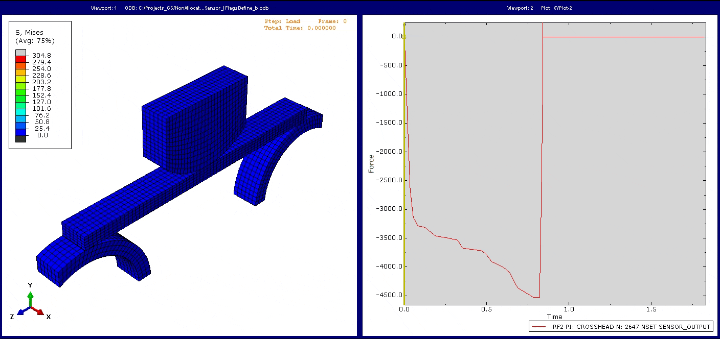 Wenn wir den Job ausführen, läuft die Lösung wie gewohnt ab, bis wir das erste konvergierte Inkrement erreichen, bei dem die Reaktionskraft am Sensorknoten größer ist als der vom Benutzer festgelegte Schwellenwert. An diesem Punkt wird der XIT-Befehl ausgeführt, und die Analyse wird ordnungsgemäß beendet.